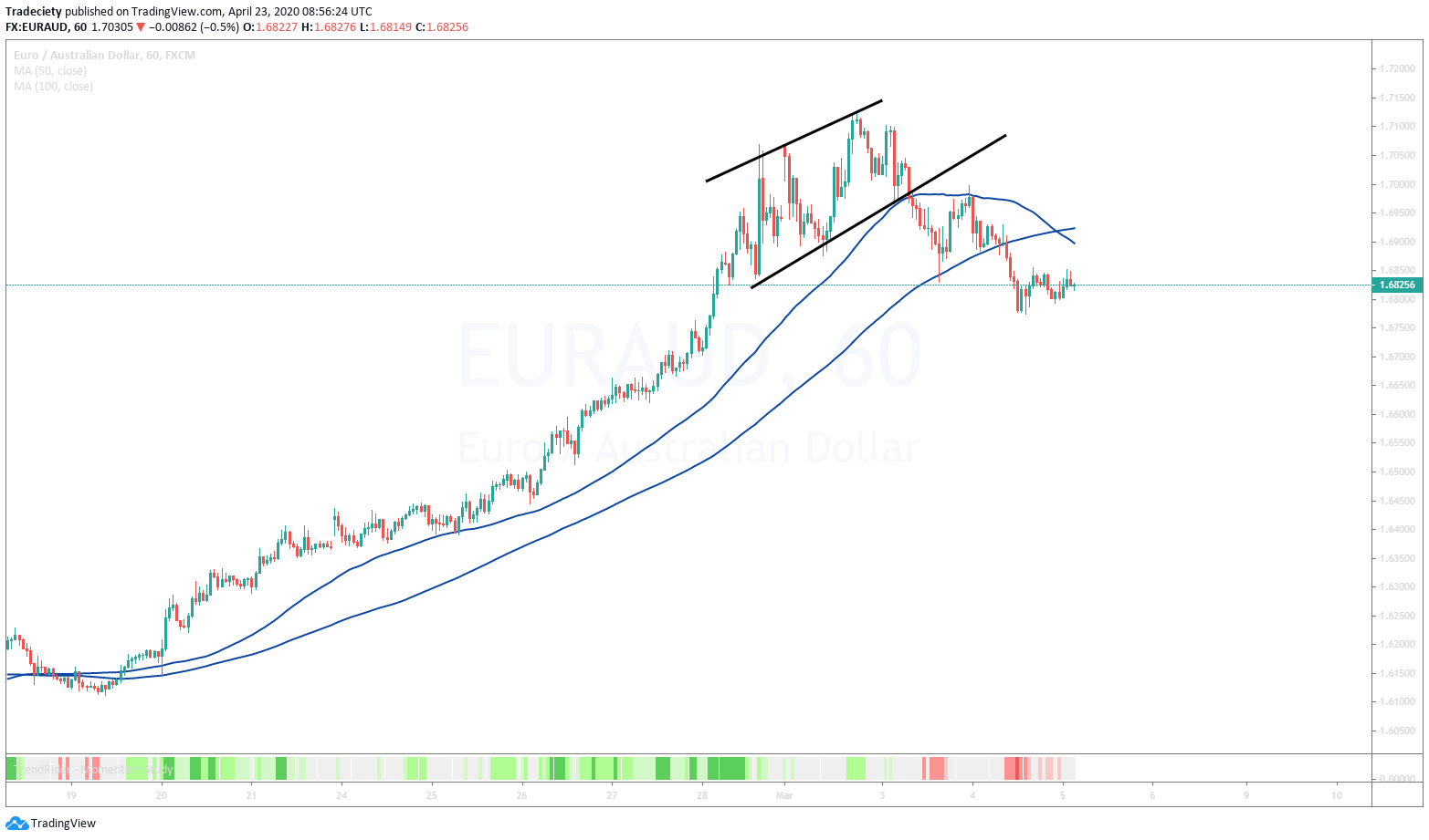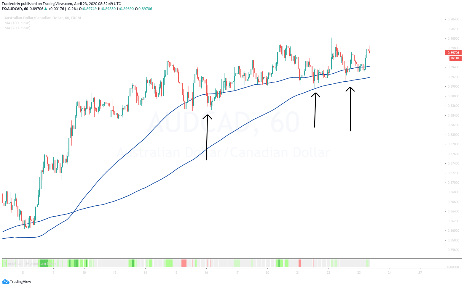 Now we are using a one hour time frame and we are also using the 100 and the 50 period moving average and you want to see that the market is reaching the zone, the higher moving average, and then you are waiting for signs that the market is really resuming. It is not enough to just trade based on the moving average touch. That is not a strong enough signal because eventually at one point the market will usually break the moving average,