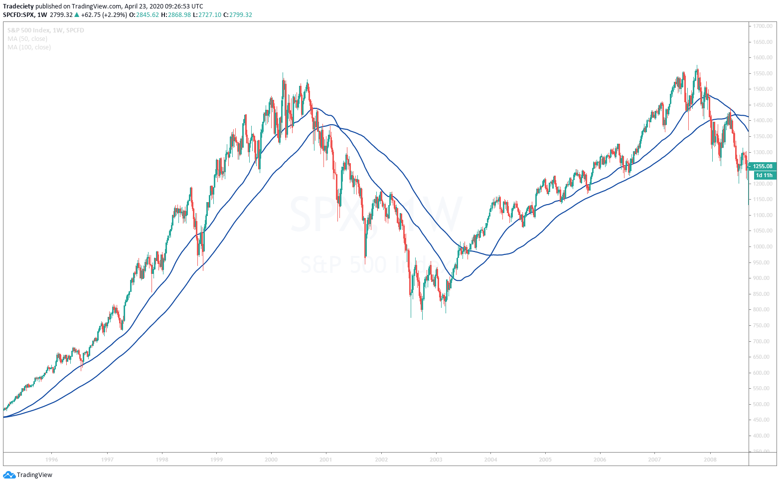 So here in this example, we have the 100 period and the 200 period moving average. I use a simple moving average. It doesn’t really matter and the differences between the SMA, the EMA, are very, very small. The most important thing is that you always keep the same moving average. So don’t use the simple moving average the one day, then the next day you use the exponential moving average. Choose one and then stick to it. And the way we are using in this example the moving averages is to help us identify trend momentum and trend strength. So here you can see the market was in a very, very strong trend and the price was well above both moving averages. And then here on the second part of this window and this screenshot, something has changed here in the market dynamics, the market reaches the moving average for the first time.