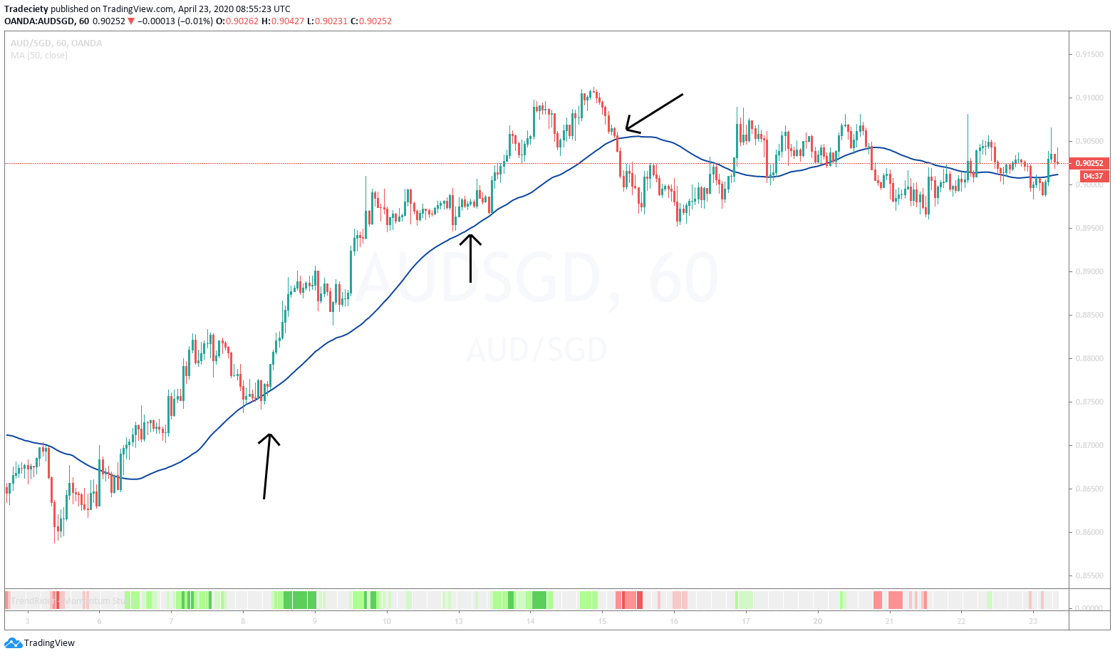 it broke the two moving averages and then you can see the same pattern existed on the way up as well. Dips into the moving average, pullbacks into the zone and then a continuation.