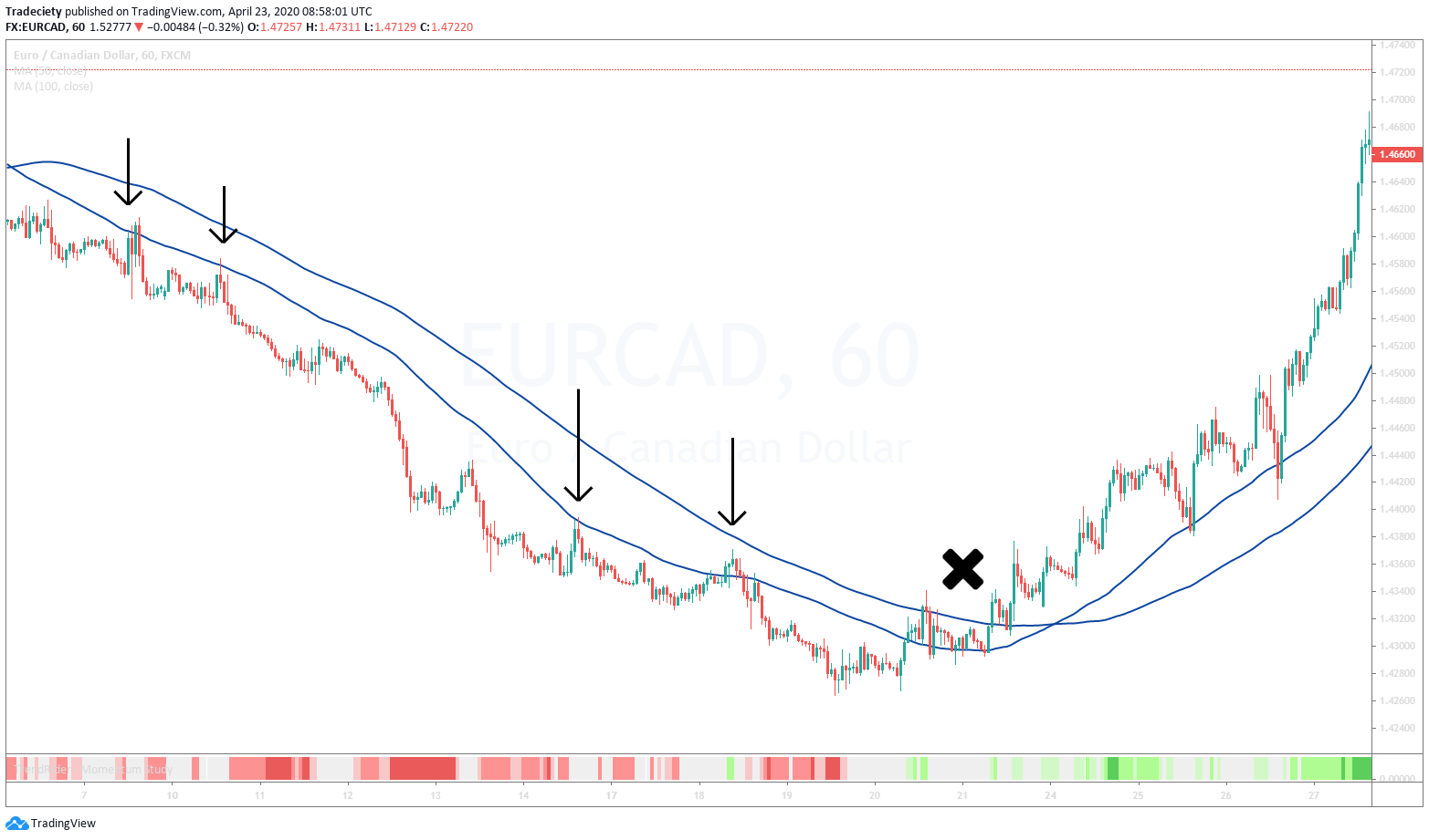 They are often scared of giving back profits and the moving average tunnel is a great trend following tool and you can see during trending markets the moving average will often be respected or at least it will hold as long as the market is really in a trending mode. And when the trend is then slowing down or when a trend is pausing, then the price will dip into the moving average and it will also completely break the moving average. That’s the time when to get out. And the moving average tunnel is really a great tool that can be applied and added to any trading strategy to just provide more confidence in the price action.